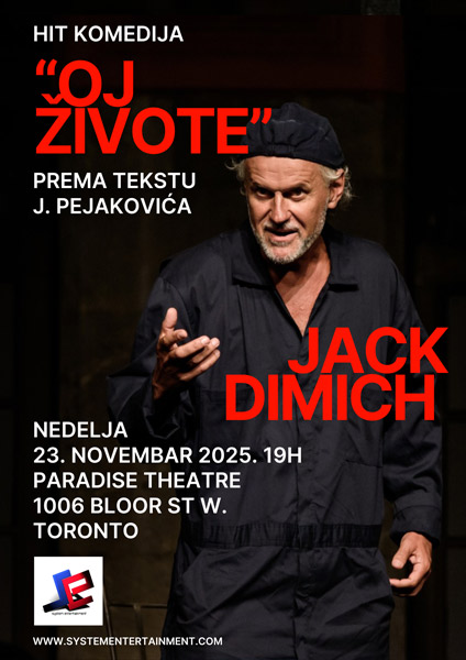 Predstava „Oj živote“, nastala prema tekstu Josipa Pejakovića. Mešavina humora i tuge publiku navodi da se sa njegovom pričom poistovećuje i sa njom saoseća. Predstava je do sada igrana u Los Anđelesu, Čikagu, Njujorku, Beogradu... ***** Jack Dimich je američki glumac poreklom iz bivše SFRJ. U svojoj bogatoj karijeri Jack Dimich (Željko Dimić), odigrao je preko osamdeset uloga na filmu, televiziji i u pozorištu. U Njujorku je 1997. godine primljen na čuveni Institut za film i teatar Lee Strasberg, glumačku akademiju na kojoj su, između ostalih, diplomirali i Al Paćino, Dastin Hofman, Armand Asante, Rebeka De Mornej i drugi. Predstava Emigranti prvi je njegov rad na srpskom jeziku na kojoj je sarađivao sa Žarkom Lauševićem. Svojevremno je tumačio glavnu ulogu u filmu U ime sina, a ovaj film bio je nominovan za prestižnu nagradu Oscar Američke akademije u kategoriji kratkog igranog filma. Poznat je po zapaženim ulogama u serijama: LAW & ORDER, CSI, BURN NOTICE, CASTLE, THE BLACKLIST, ELEMENTARY, SLEEPER CELL, HAWAII, FIVE-O, MADAM SECRETARY, LILYHAMMER, LIMITLESS, BRAINDEAD, STARTUP, BLUE BLOODS, WELCOME TO BROOKLYN i UNDERCOVERS. Na našim prostorima igrao je epizodne uloge u filmovima: TURNEJA Gorana Markovića, TRAVELATOR Dušana Milića, SRPSKI OŽILJCI Vladimira Rajčića, VOLJA SINOVLJEVA Nemanje Ćeranića, KLJUC, Marka Sopica, LINIJA, Dragana Elcica i NEKE DRUGE PRIČE Ane Marije Rossi... 2013.godine igrao je naslovnu ulogu Nikole Tesle u predstavi TESLA engleske autorke Sheri Graubert na Off Brodway-u u Njujorku ... ***** Jack Dimich is American character actor born and raised in former Yugoslavia. He graduated full time program (1997-2001) at The Lee Strasberg Institute For Film, Theater And Television in New York and since then he has over 90 roles on television, film and stage. In 2009. he won various awards at 22 international film festivals with his first leading role in short feature film IN THE NAME OF THE SON that qualified for Academy Award in a short feature category. Jack Dimich is known for his guest staring and cameo roles in major tv shows: LAW & ORDER, CSI, BURN NOTICE, CASTLE, THE BLACKLIST, ELEMENTARY, LILYHAMMER, LIMITLESS, BRAINDEAD, STARTUP, UNDERCOVERS, SLEEPER CELL, HAWAII FIVEO, MADAM SECRETARY, BLUE BLOODS, THE OUTPOST, SOPRANOS. In 2020. he portrayed Nikola Tesla in documentary feature film TESLA NATION that qualified for Academy Award in that category. He won Best Actor Award with this role at Oklahoma International Film Festival. |